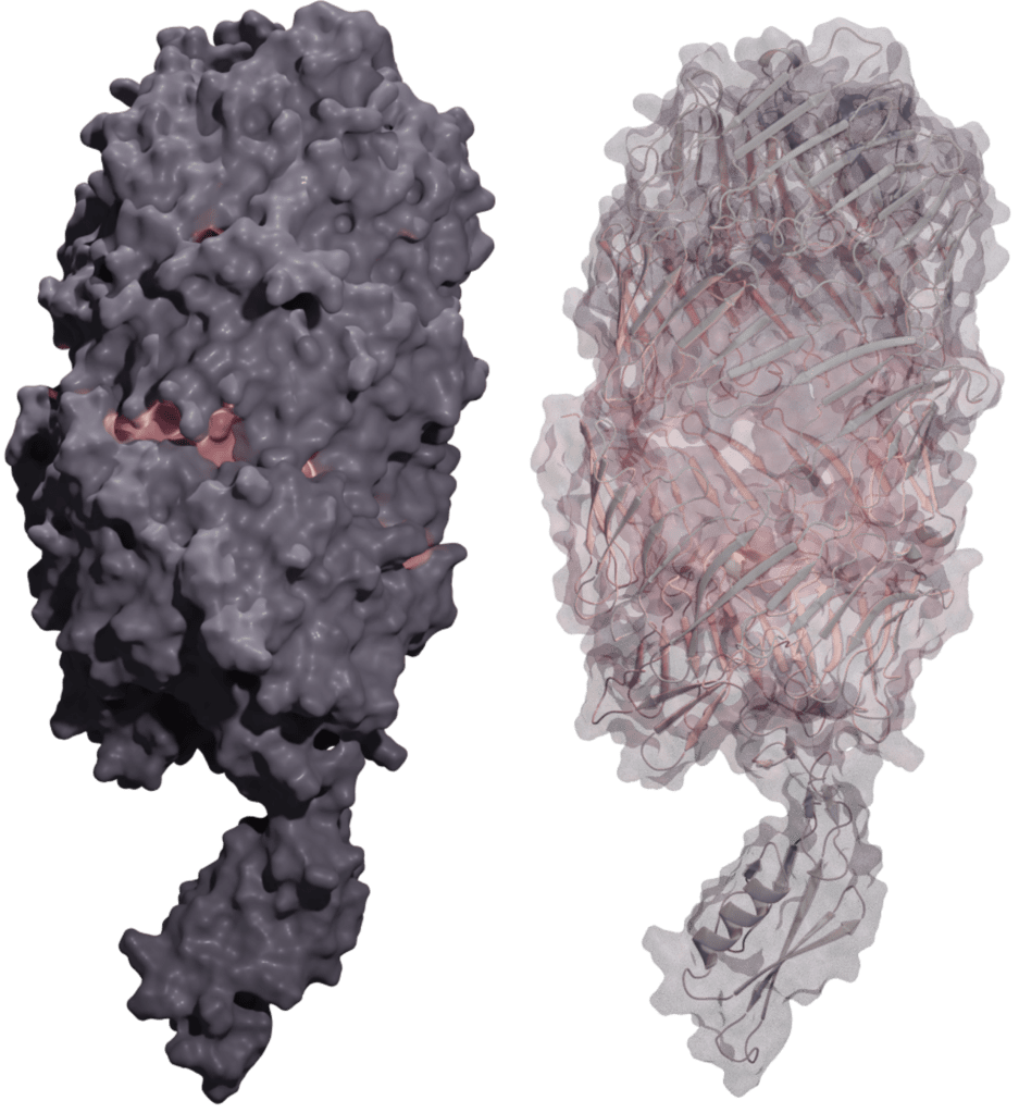 FIGURE: PxrBA toxin Model – AlphaFold prediction of the PxrBA holotoxin. The toxic effector domain is contained within the interior of the shell. Image created with blender.