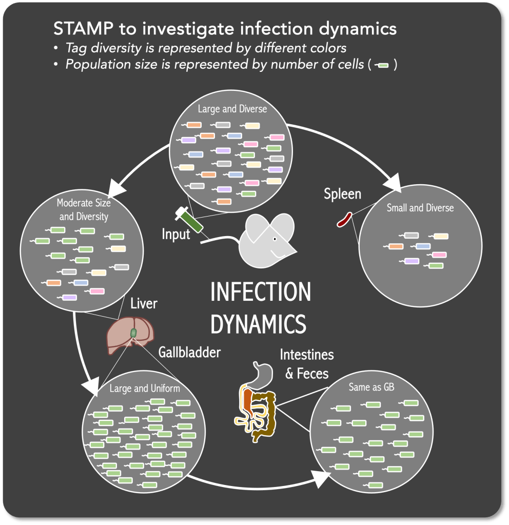 FIGURE: Cartoon diagram of a genomic barcoding approach to quantify population bottleneck effects in vivo. This process termed STAMP (sequence tag-based analysis of microbial population dynamics) tracks changes to an infecting population’s richness and evenness during the course of an infection.